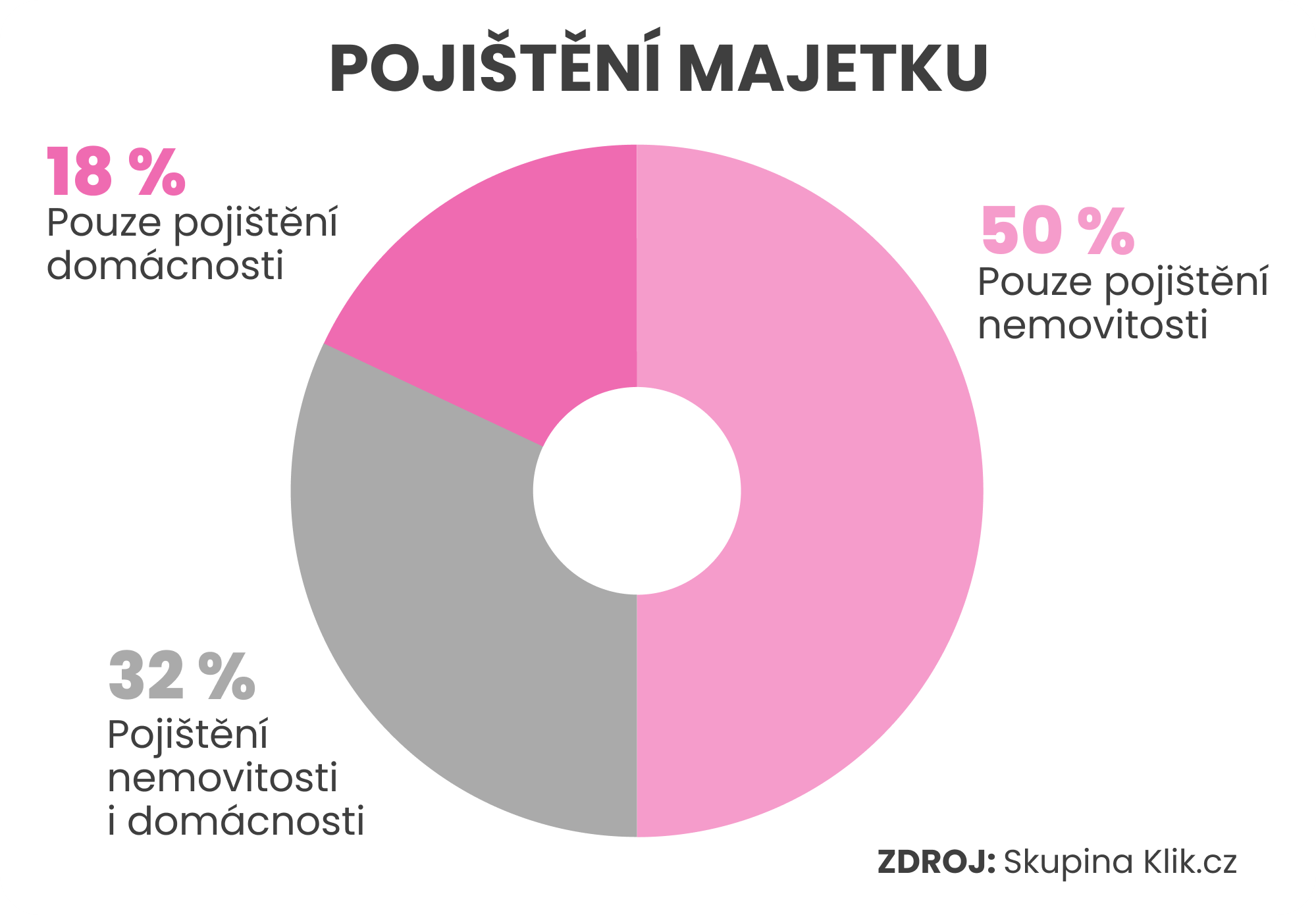 Polovina domácností v Česku stále nemá žádné pojištění majetku. Navíc, podle dat Skupiny Klik.cz, si 50 % klientů pojišťuje jenom samotnou nemovitost a 18 % klientů jenom samotnou domácnost. Pouhých 32 % klientů si pojišťuje obojí, tedy domácnost i nemovitost. Poslední průzkum České asociace pojišťoven dokládá, že až 1,6 milionů nemovitostí je stále nepojištěných a z těch pojištěných je 70 procent pojištěno nedostatečně.